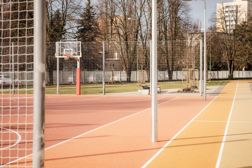 Na školskom dvore na K. Mahra sa zachovalo existujúce futbalové ihrisko, realizovala sa výmena športového povrchu z umelej trávy. V okolí ihriska sú lavice na sedenie a na severnej strane aj menšie sedenie v podobe terasovitých tribún.